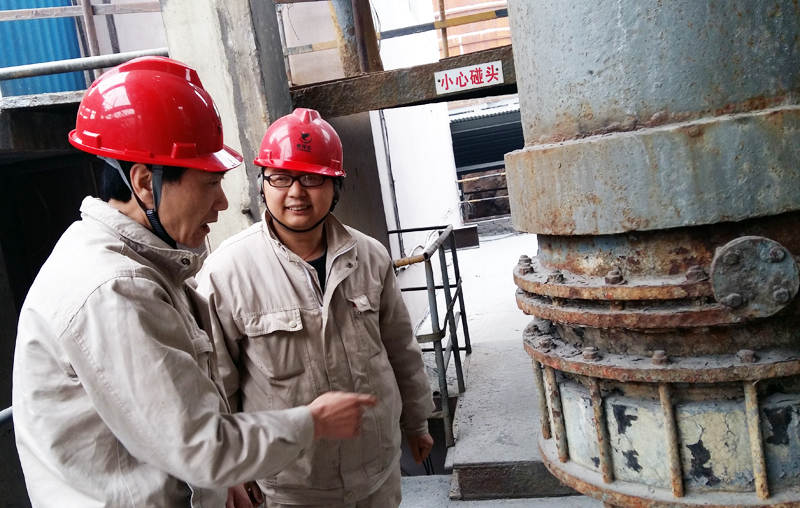 图为郭书记(左)深入车间一线,对职工进行访谈