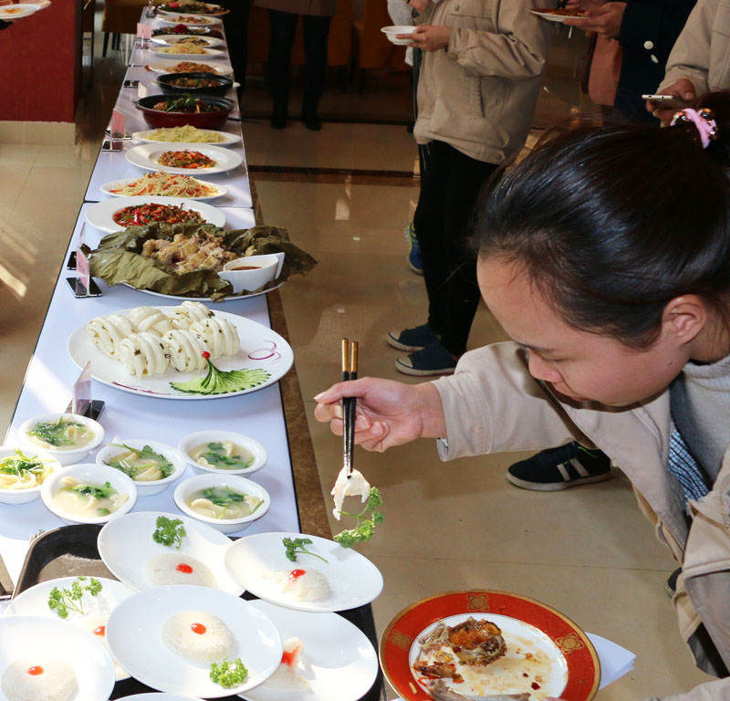 图为评委们正在品菜评分