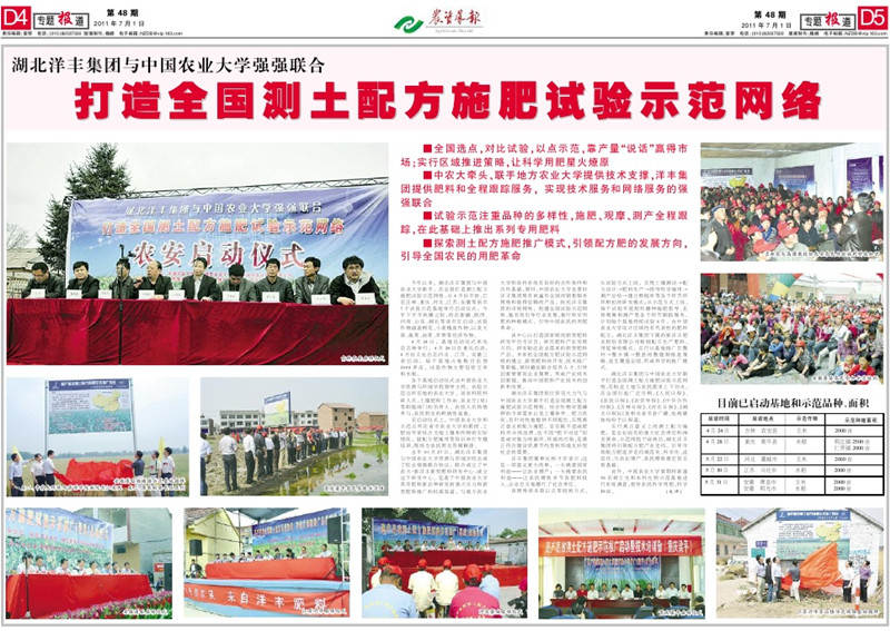 湖北洋丰集团与中国农业大学联手打造全国测土配方施肥试验示范网络,在贴近土地与农民需求上下功夫,在全国引起广泛反响,《人民日报》、《农民日报》、《农资导报》、《中华合作时报》、《吉林日报》、《河北日报》、《湖北日报》以及相关省市县广播、电视媒体纷纷予以报道。